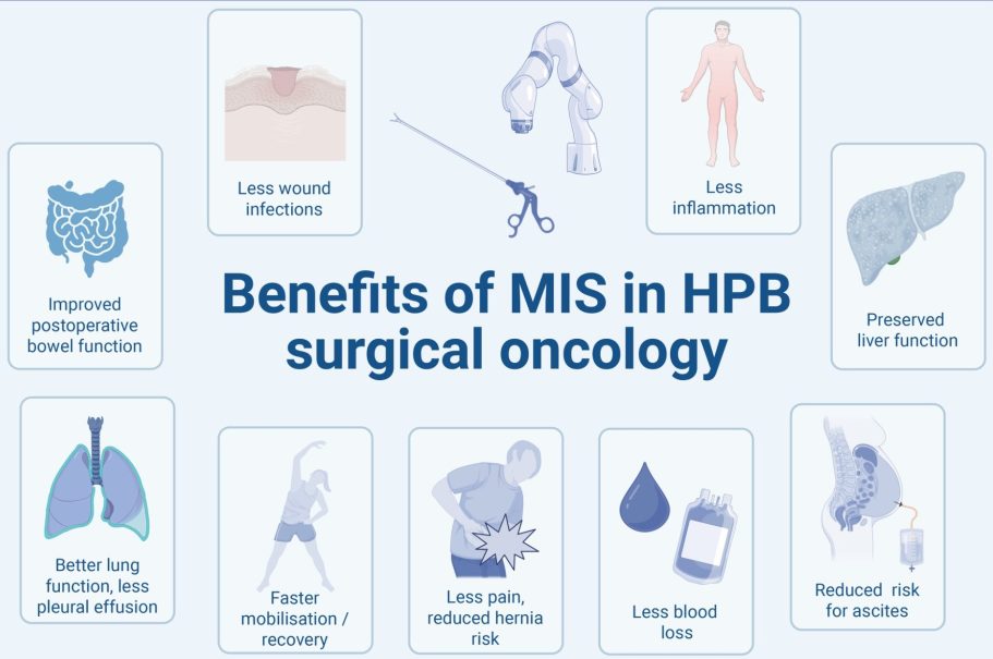 Potentielle Vorteile eines minimal-invasiven OP Zugangs bei onkochirurgischen Eingriffen an Leber, Gallenwegen und Bauchspeicheldrüse.